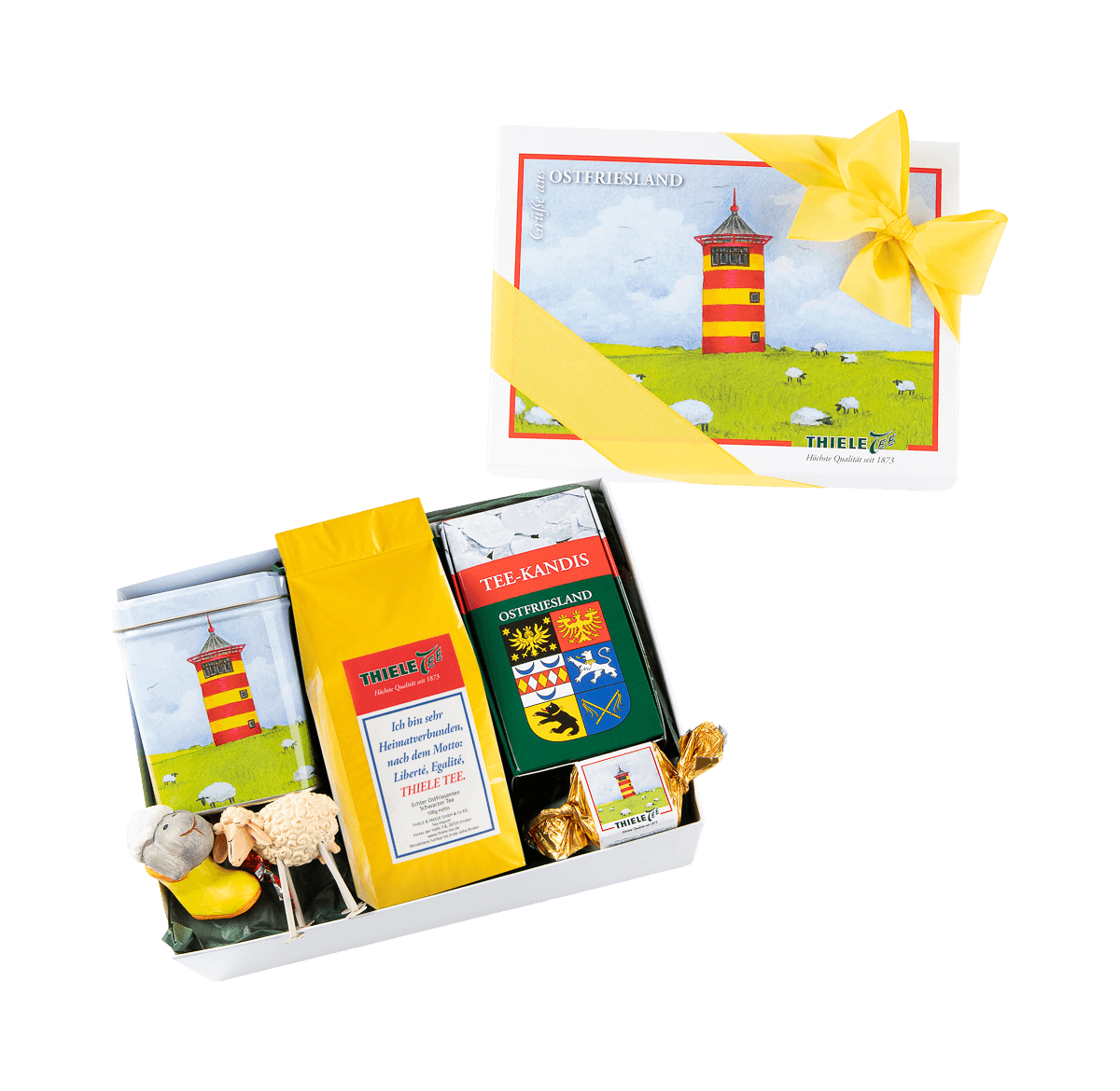 „Deichkind“ vereint alles, was Ostfriesland ausmacht: 100g Heimatverbunden – unser Echter Ostfriesentee Broken Silber – und 150g THIELE TEE Käpt’n. Dazu kommen eine dekorative Teedose mit dem Motiv des Pilsumer Leuchtturms und feine Nougathappen. Zwei kleine Dekoteile setzen liebevolle Akzente und bringen nordisches Flair auf den Teetisch.