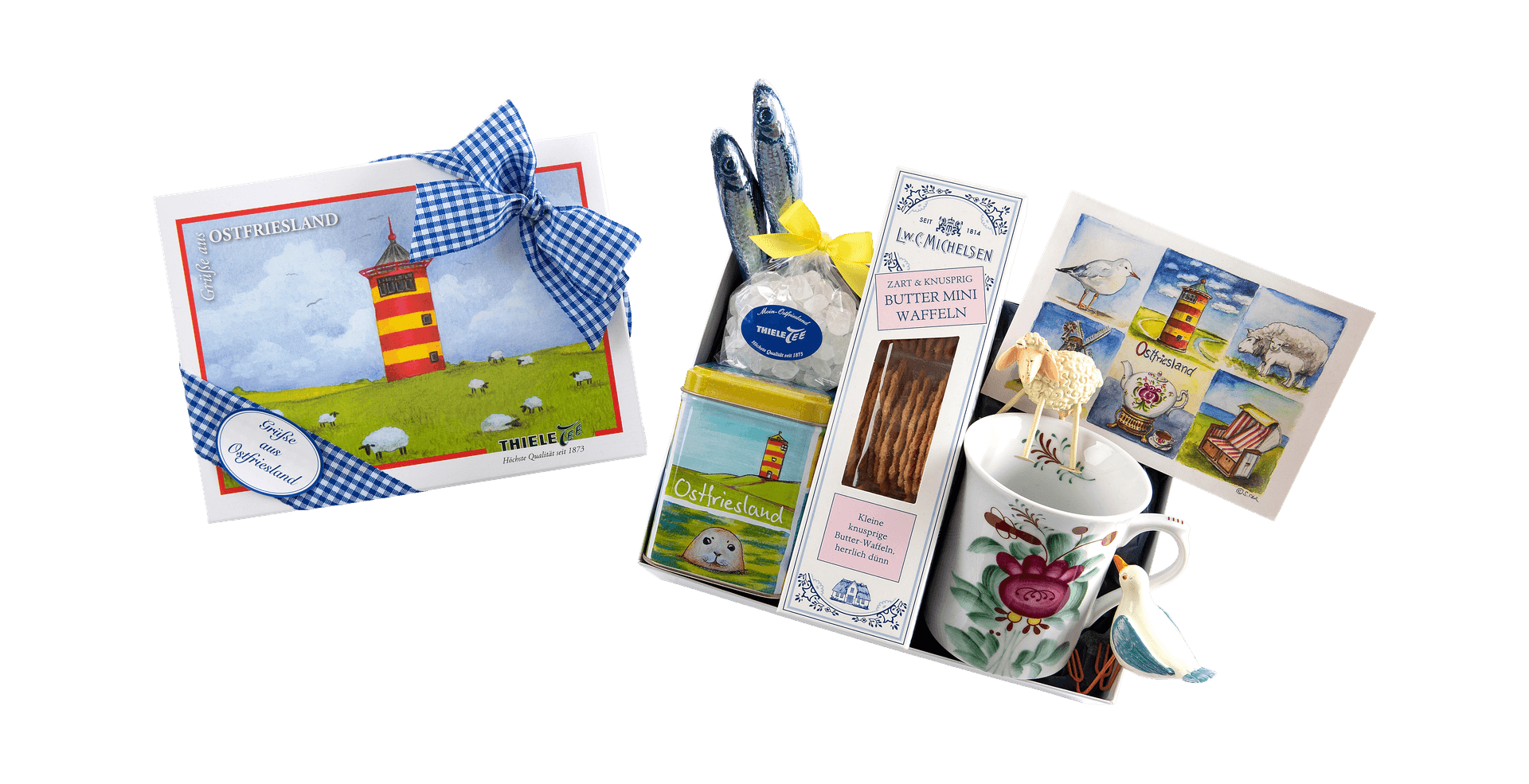 „Krummhörn“ bringt den Zauber Ostfrieslands direkt nach Hause. Die Teedose „Grüße aus Ostfriesland“ ist mit 100g Broken Silber gefüllt und wird von knusprigen Butterwaffeln, feinem Kandis und zwei süßen Schoko-Matjes begleitet. Ein Porzellanbecher im klassischen Dekor Ostfriesenrose sowie eine Postkarte aus Ostfriesland ergänzen das Ensemble. Dekoteile in Form von Schaf und Möwe setzen maritime Akzente und verleihen dem Präsent einen besonderen Charme.