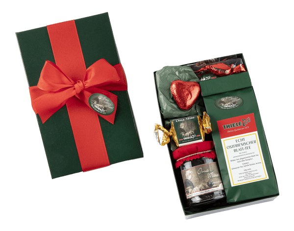 „Oma Mine’s Kant“ vereint klassische Teekultur mit süßen Besonderheiten – so gemütlich, wie man es von Oma kennt. Enthalten sind 100g Echter Ostfriesischer Blatt Tee mit feiner Vanille, 210g Oma Mine Fruchtaufstrich sowie ein Nougathappen im Oma-Mine-Design. Ein zartes Schokoherz rundet das liebevoll zusammengestellte Präsent ab.