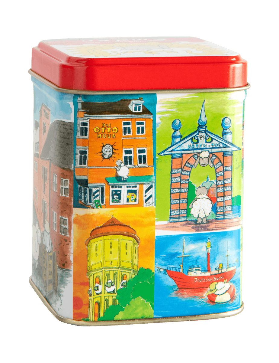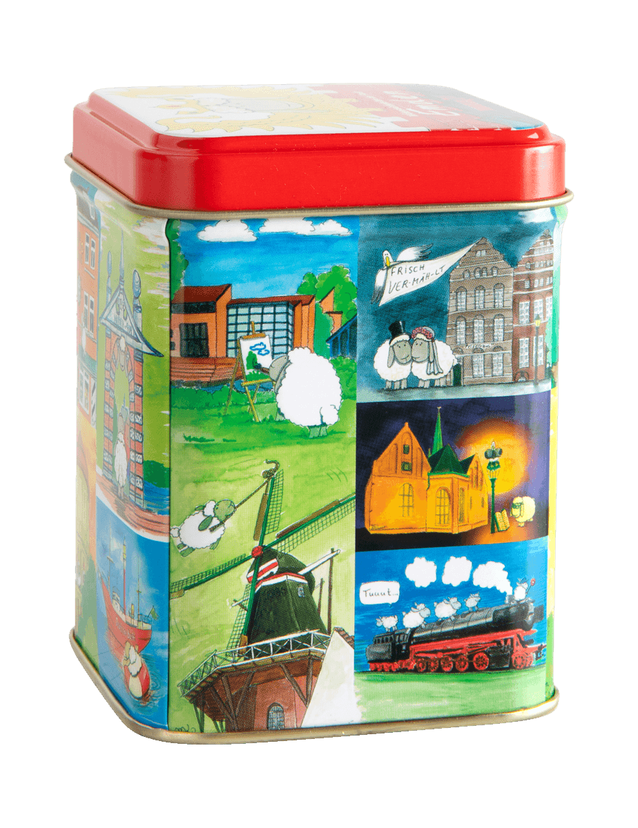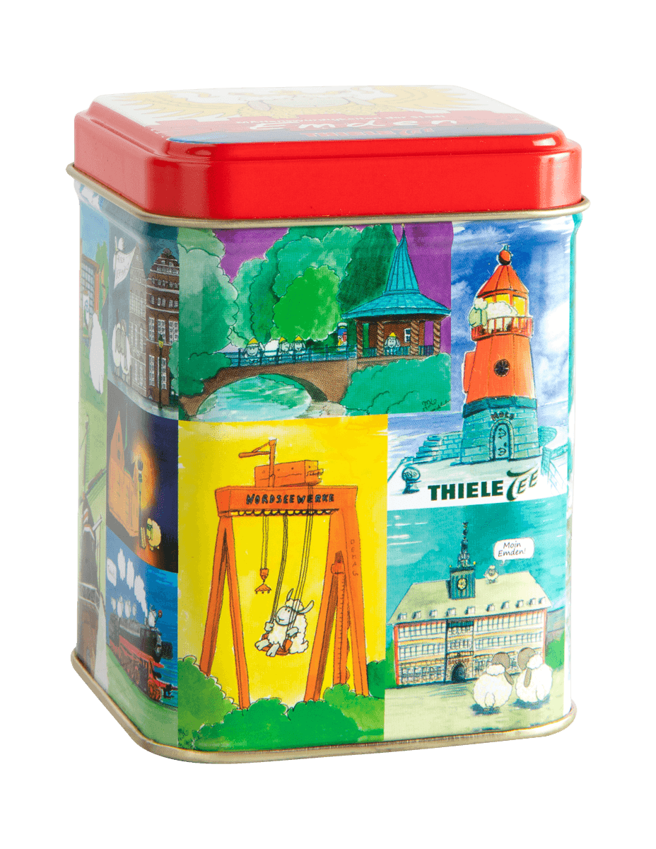 Dekorative Dose mit Motiven aus Emden – ein Souvenir, das sich wunderbar mit Ihrem Lieblings-Tee befüllen lässt.