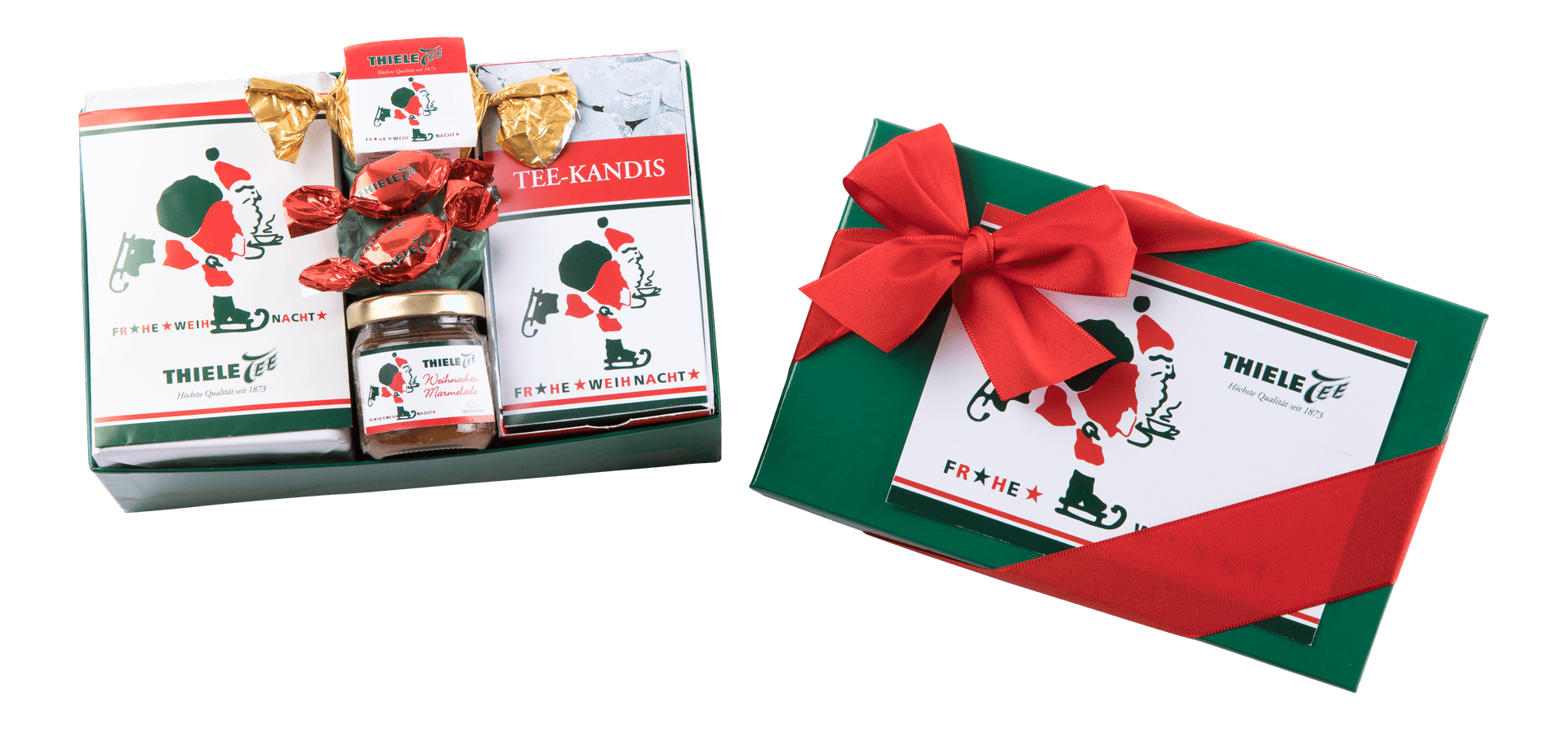 Wenn der Weihnachtsmann kommt, bringt er Genuss mit – echt ostfriesisch und mit viel Herz. „De Wiehnachtsmann kummt“ vereint 100g THIELE TEE Broken Silber in einer dekorativen Weihnachtsmann-Dose mit 50g festlichem Weihnachts-Fruchtaufstrich und 150g feinem Kandis. Zwei THIELE TEE Bonbons, eine Weihnachtskarte und ein 25g Weihnachtshappen ergänzen das liebevoll zusammengestellte Präsent.