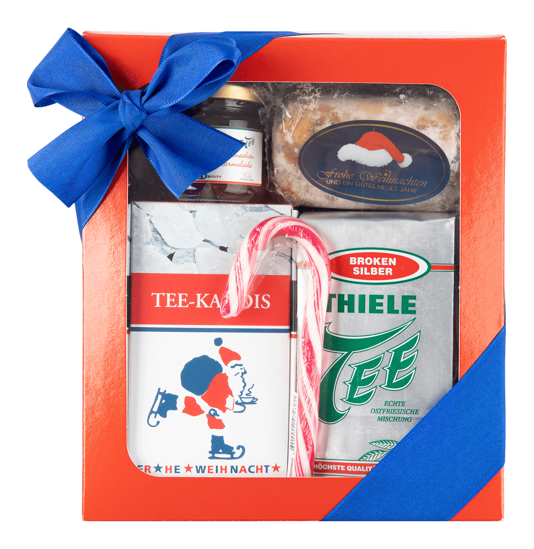 Ein liebevoll zusammengestelltes Präsent voller festlicher Genüsse: „Weihnachts-Leckereen“ vereint 125g THIELE TEE Broken Silber – den Klassiker unter den Ostfriesentees – mit 150g feinem Kandis, einer Zuckerstange, 80g saftigem Christstollen und 50g aromatischer Weihnachtsmarmelade.